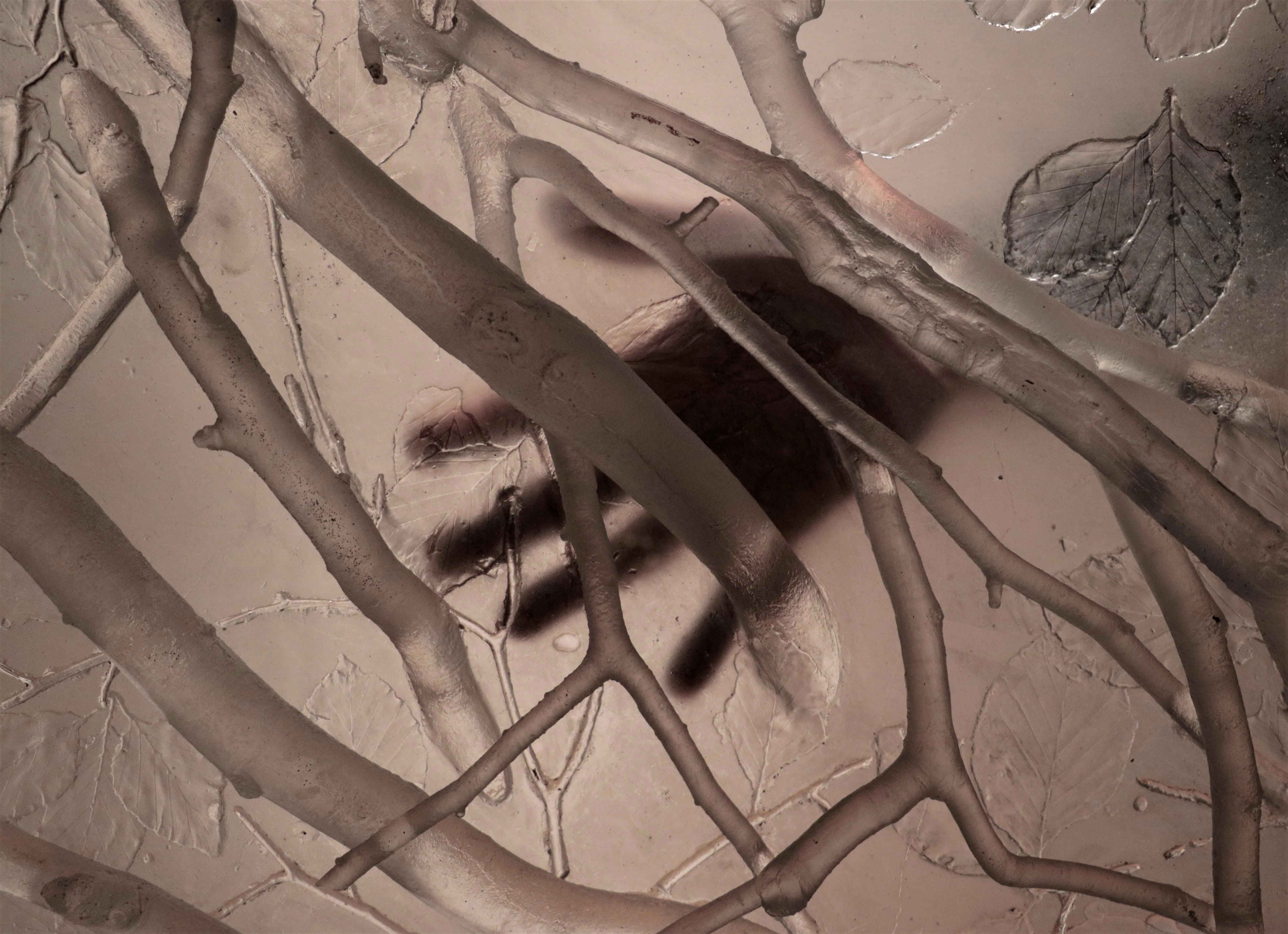Cette canopée en verre moulé et non teinté a l’ambivalence de suggérer une ombre, l’ombre bienfaisante des arbres. C’est la cabane au fond du jardin, la tente dressée au milieu du salon : un refuge. C’est aussi un paysage au dessus de nos têtes, dans lequel le regard se meut au gré des bifurcations des branches et de la texture des feuilles. Branches, feuilles et fond se mêlent dans un même degré de translucidité et les formes sont dessinées par la lumière qui les traverse.