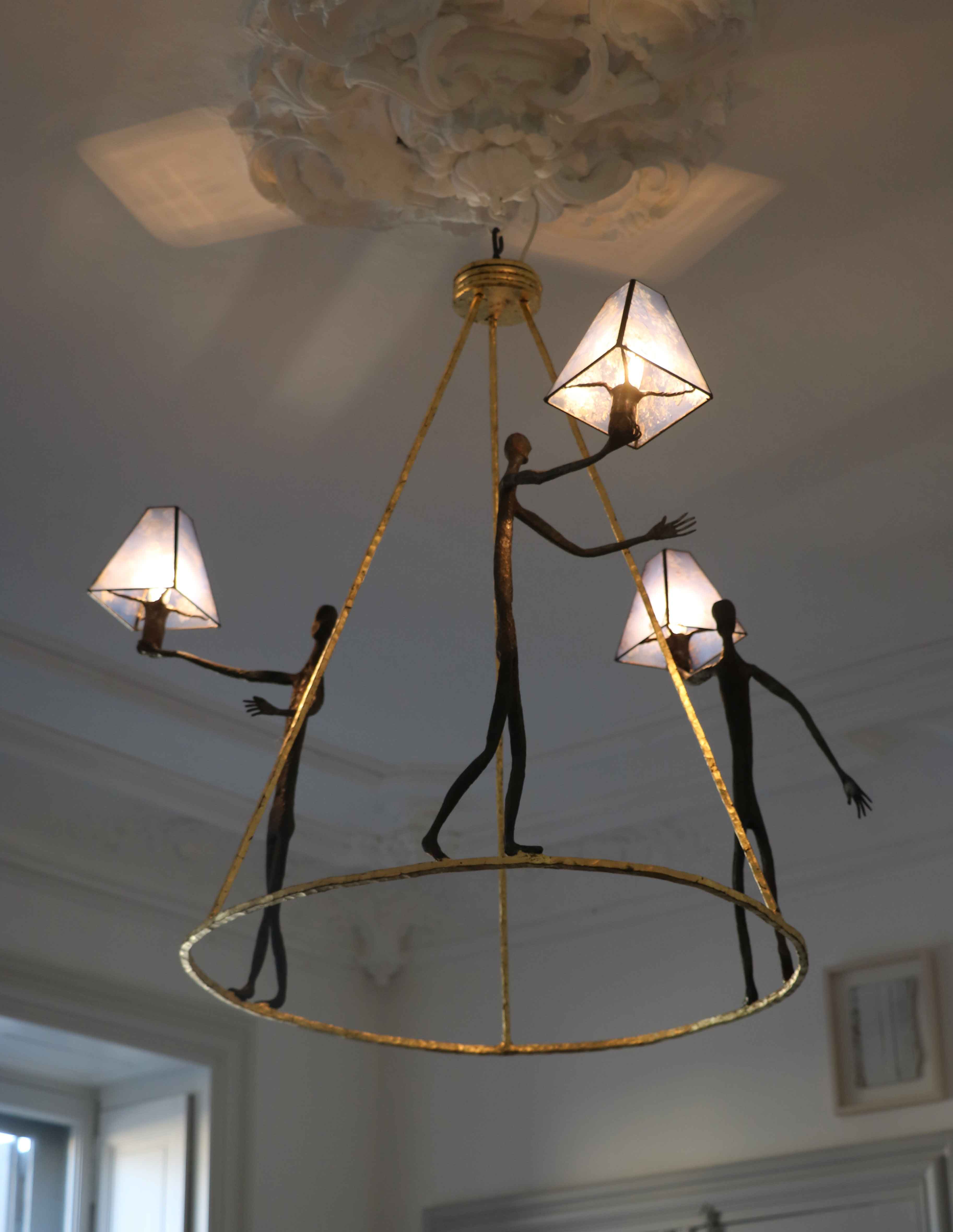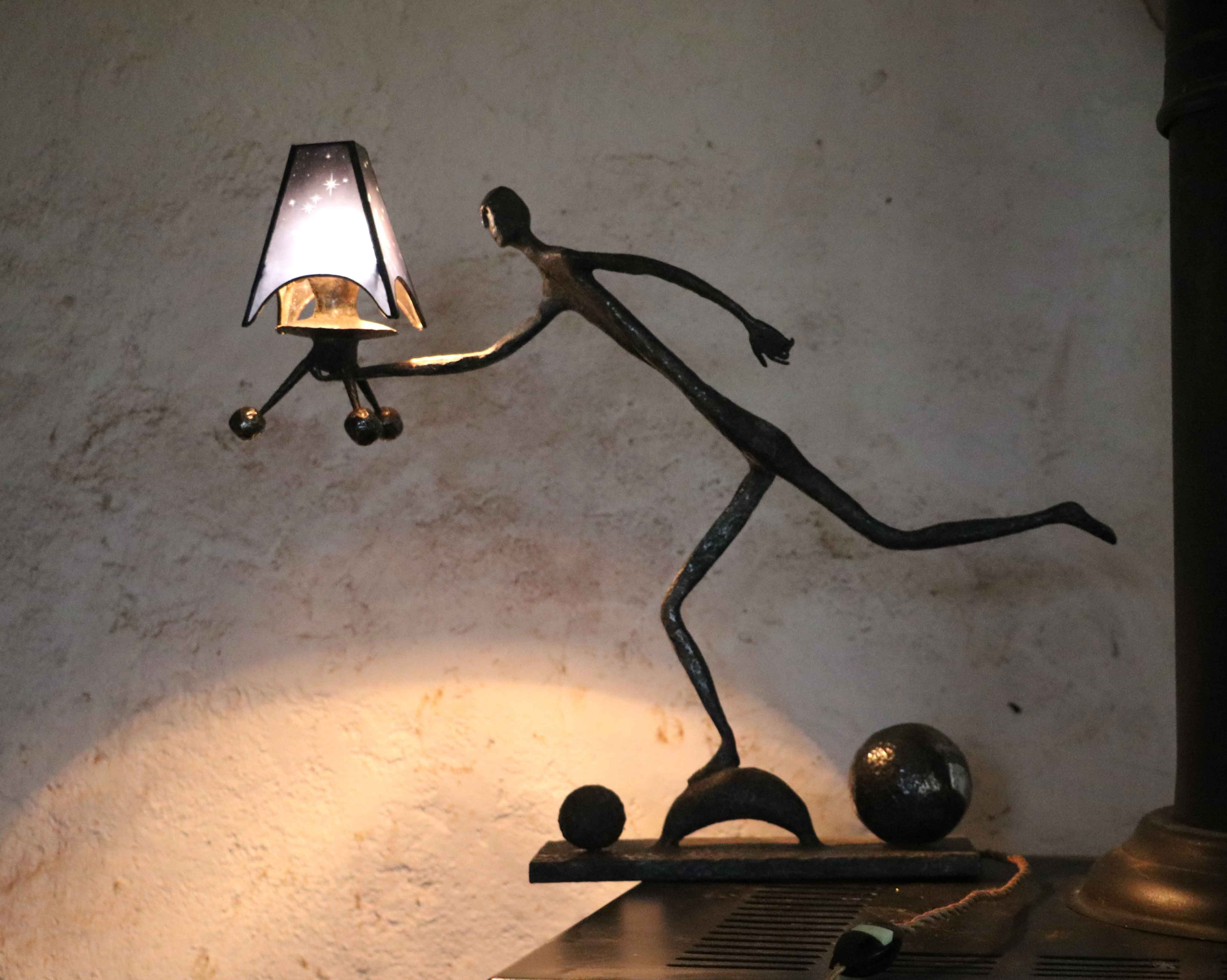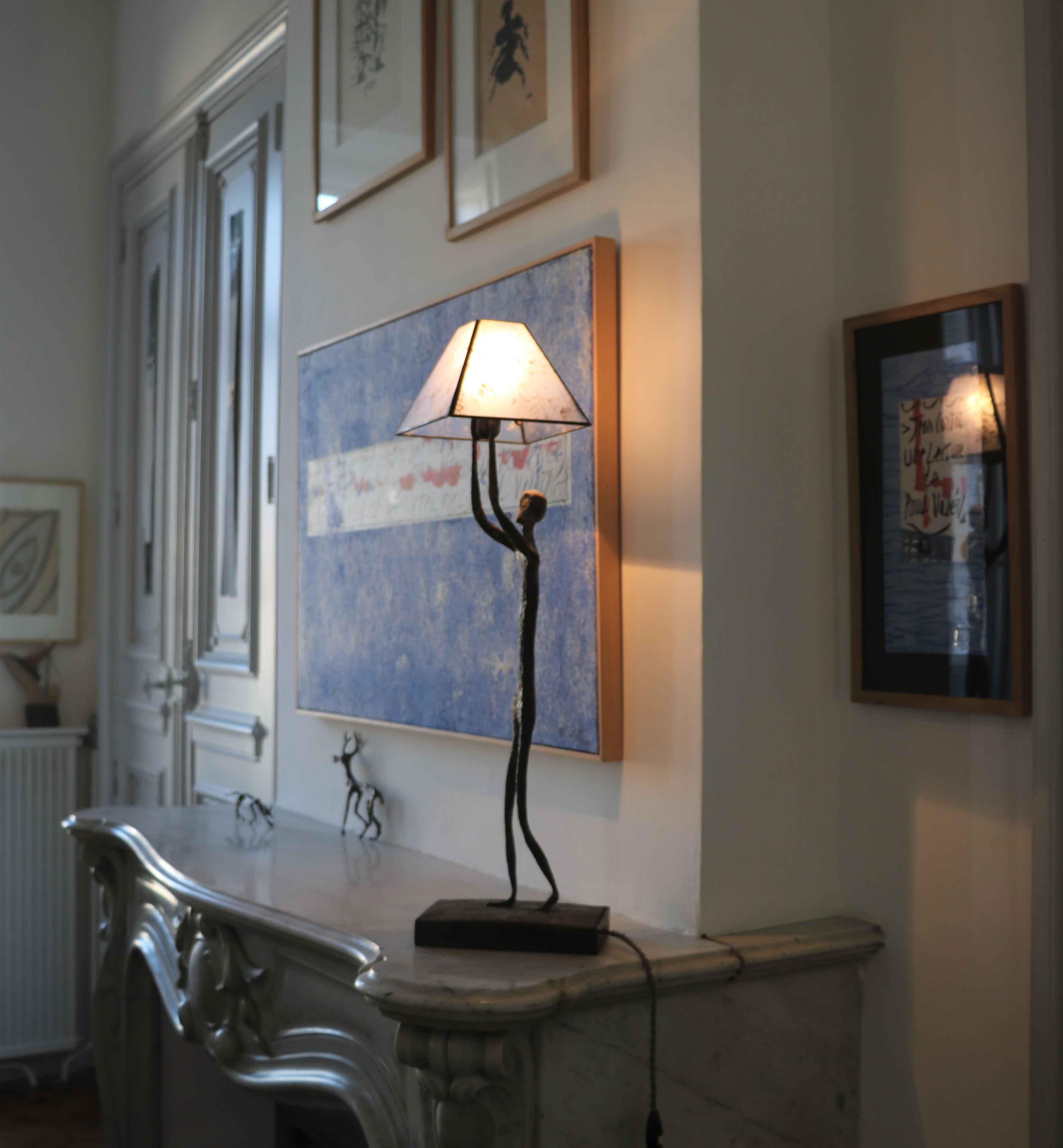Pieds en fer forgé par Quentin Parant, chapeaux en verre peint à la grisaille. Il s’agit d’objets pensés et conçus à deux.