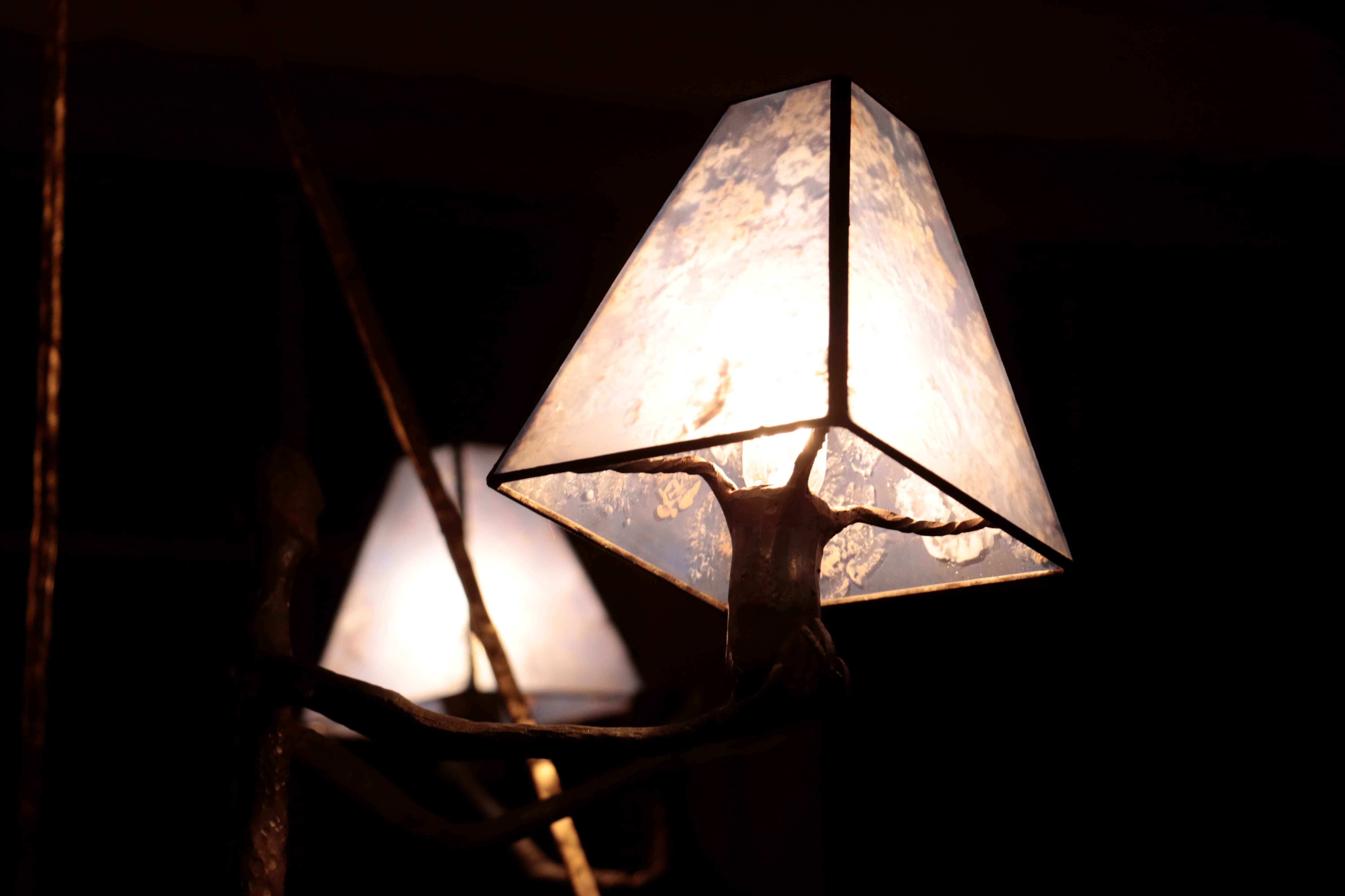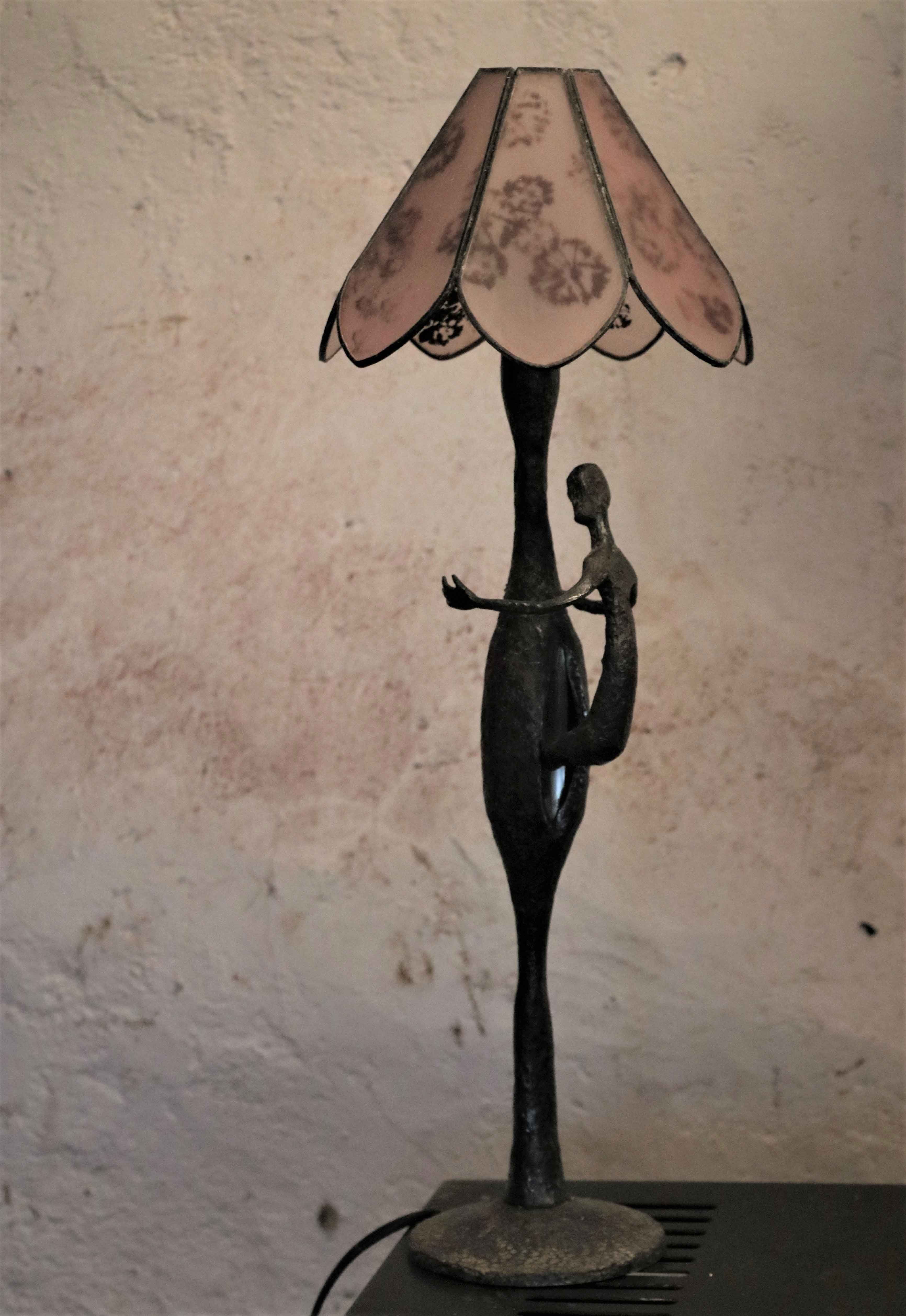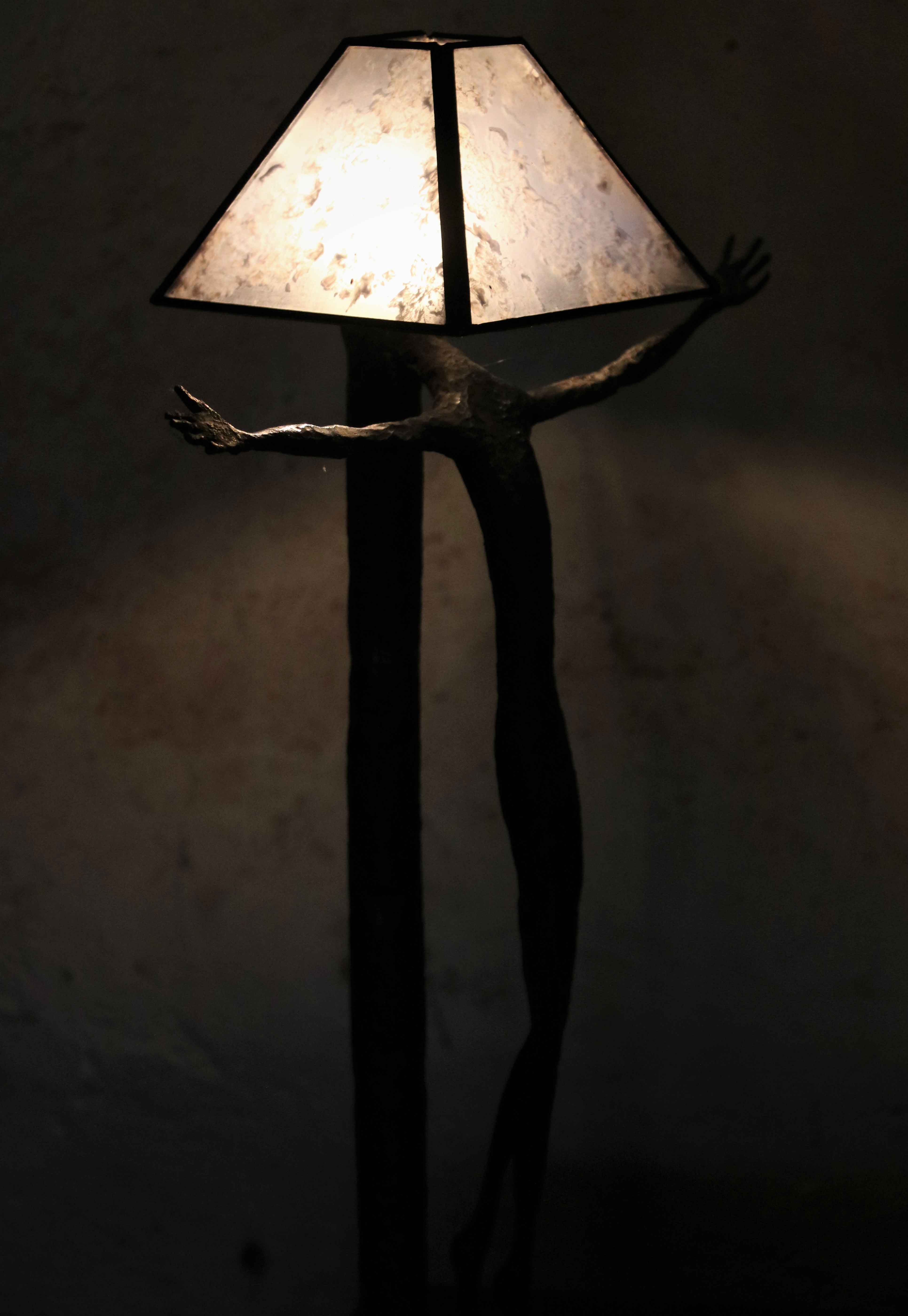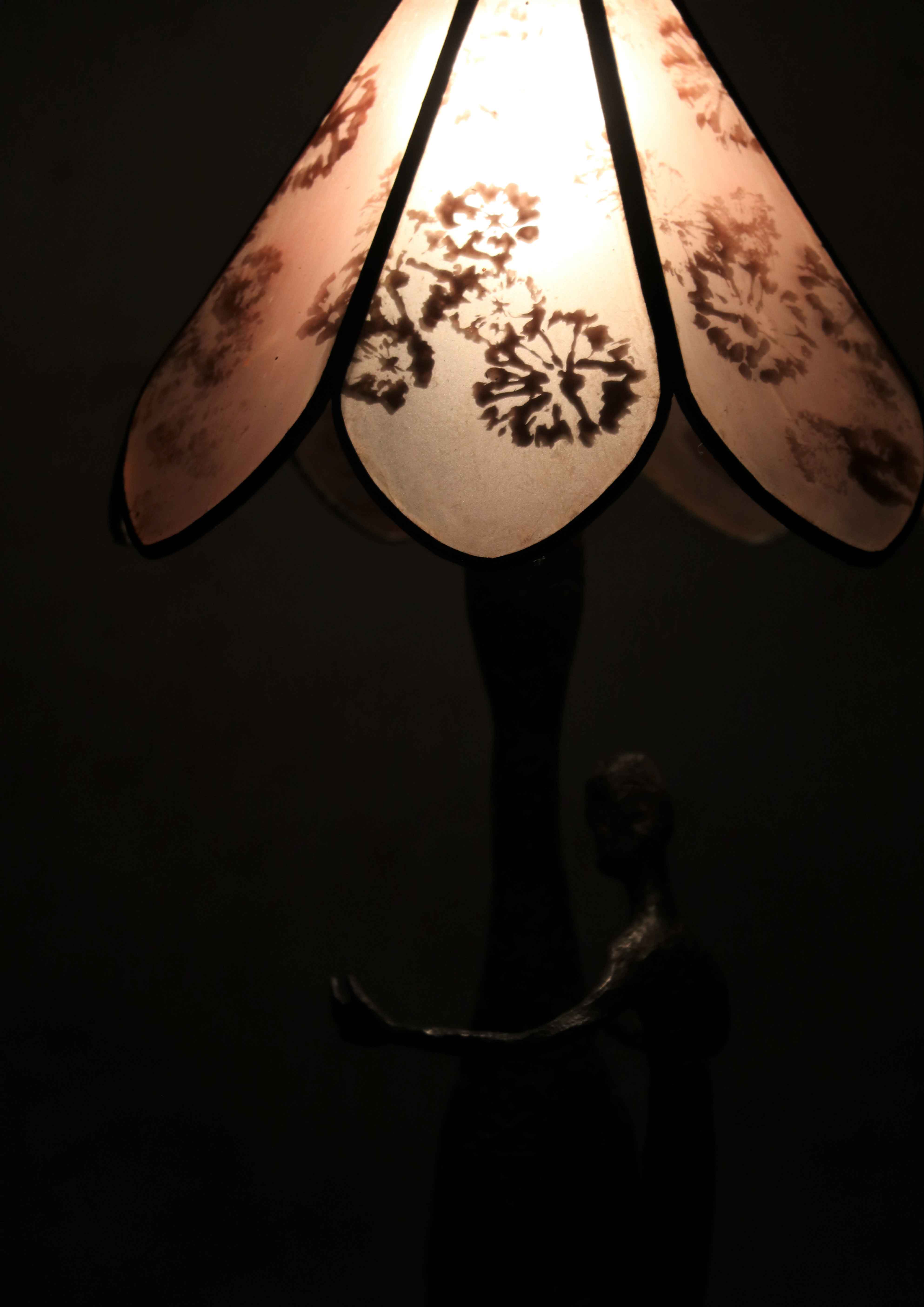 Pieds en fer forgé par Quentin Parant, chapeaux en verre peint à la grisaille. Il s’agit d’objets pensés et conçus à deux.