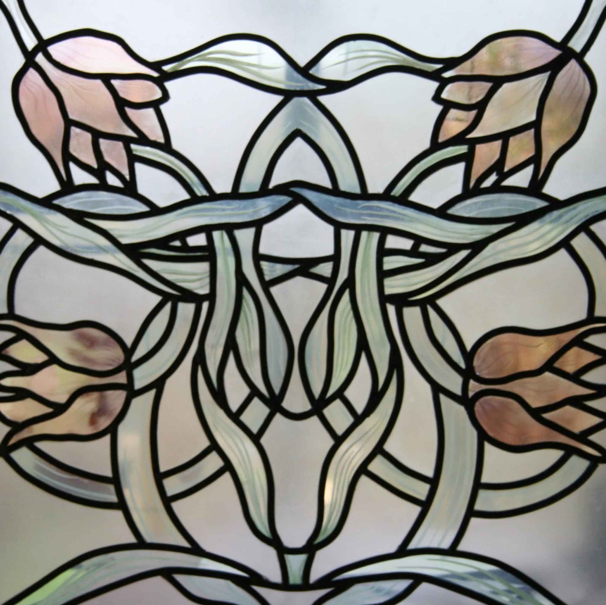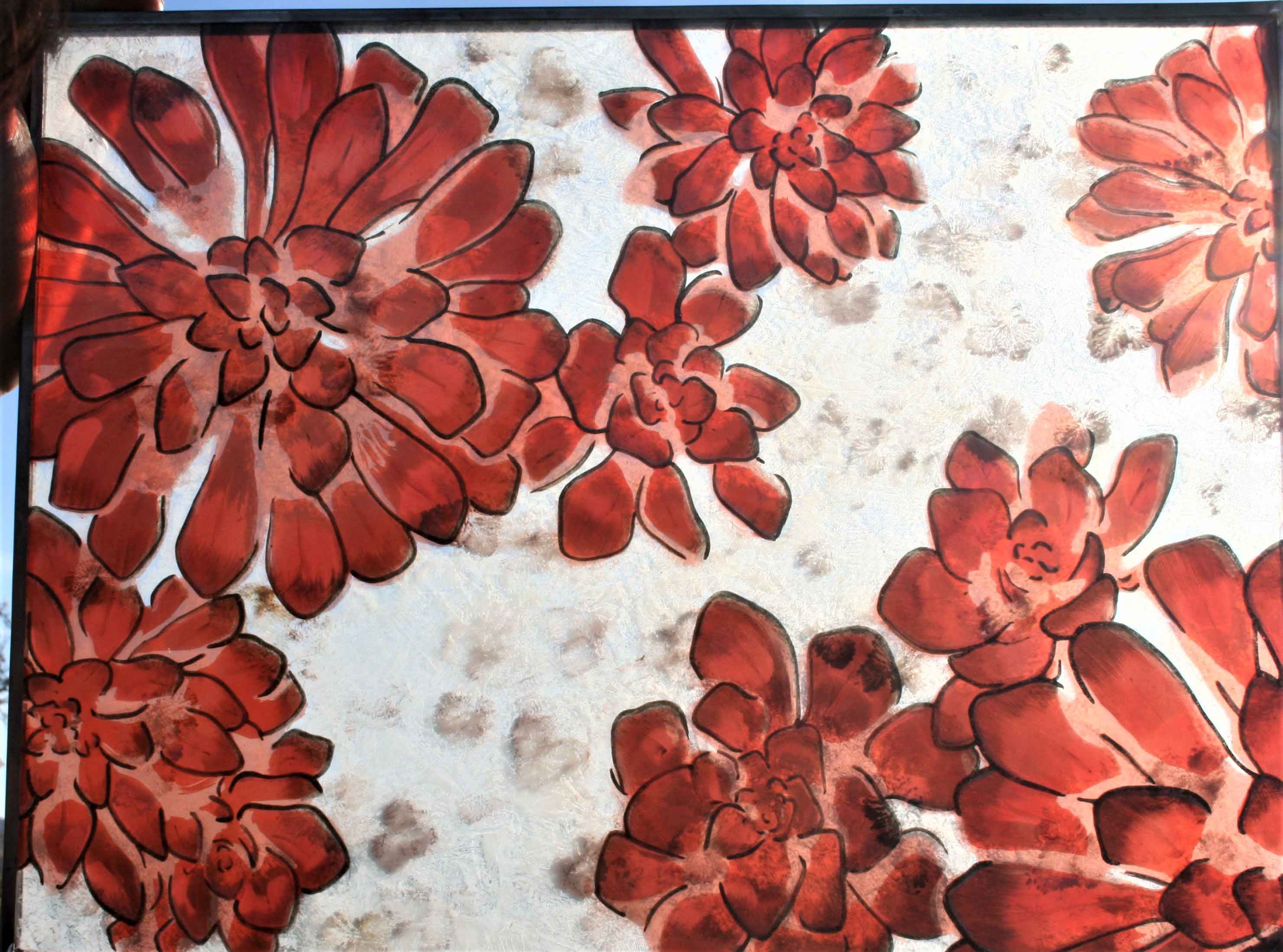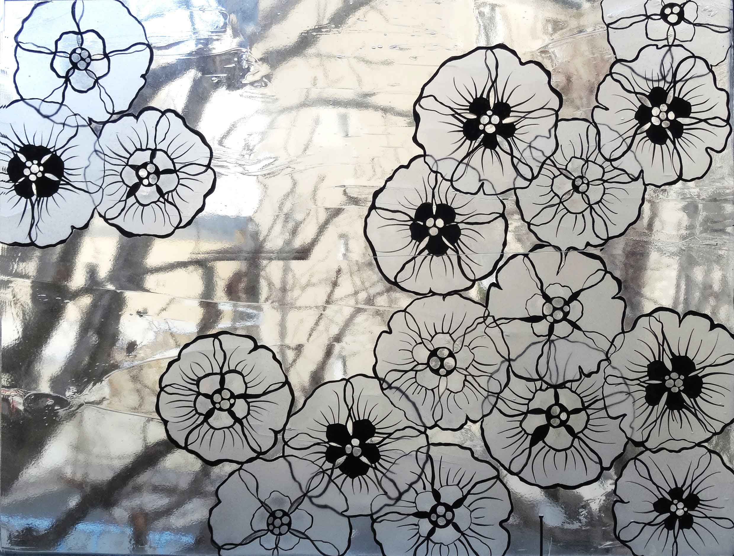 Roses trémières, peinture à la grisaille sur verre texturé.