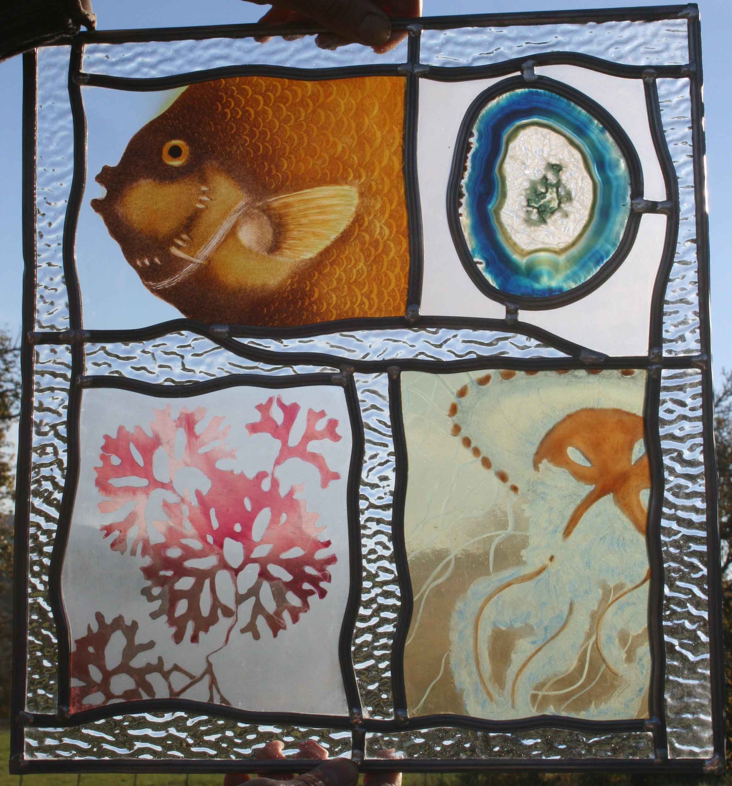 La mer, verres, plomb, peintures, agate. 36x39.5cm, 2016.