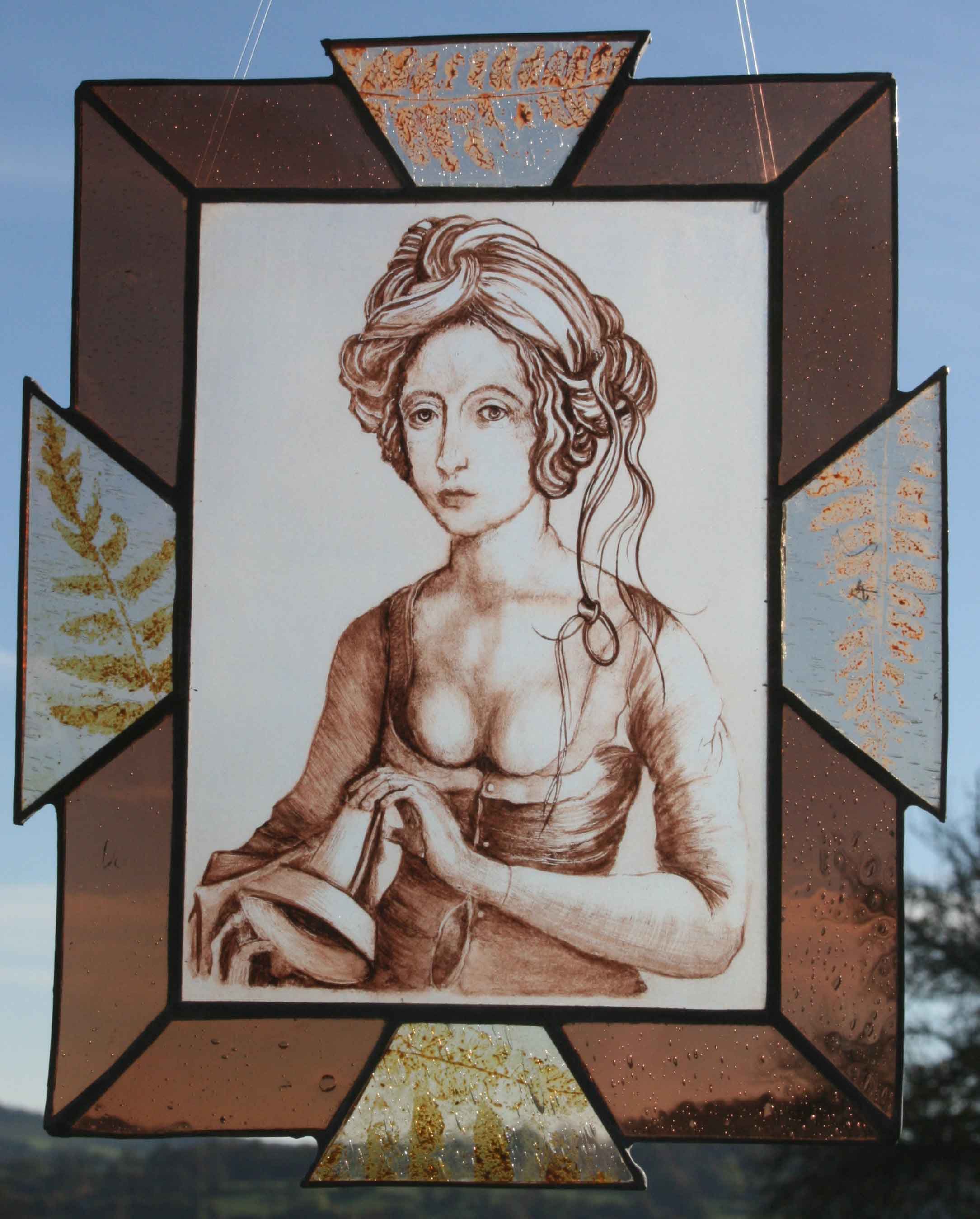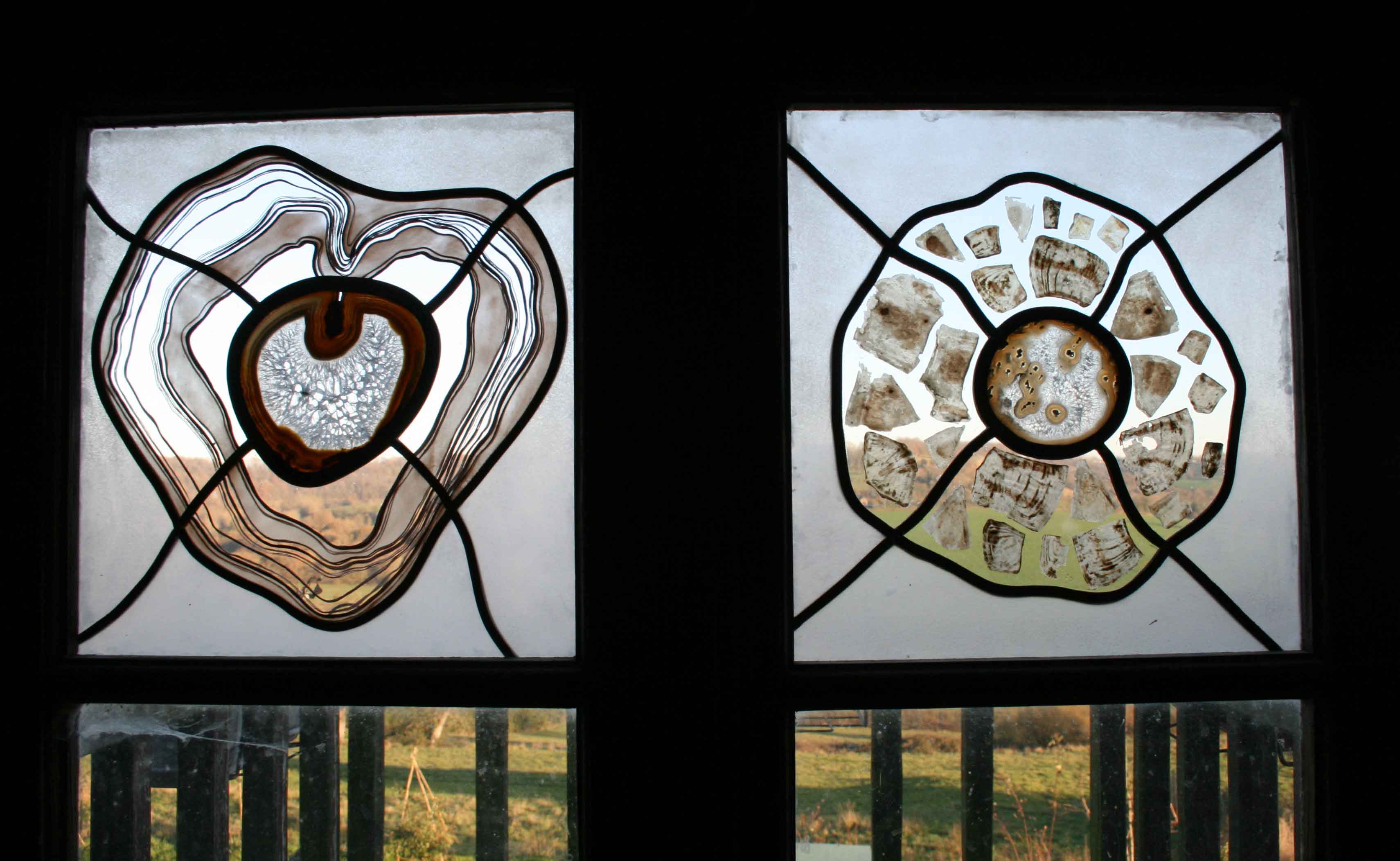 Sans titre, verres peints, plomb, agates, écailles de tortue.